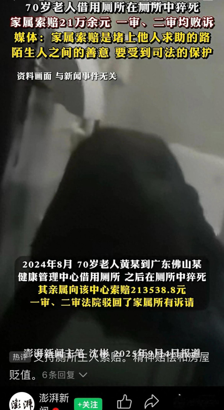 2024年8月,70岁老人黄某到广东佛山某健康管理中心借用厕所 ,之后在厕所中猝死!其亲属向该中心索赔213538.8元一审、二审法院驳回了家属所有诉请!