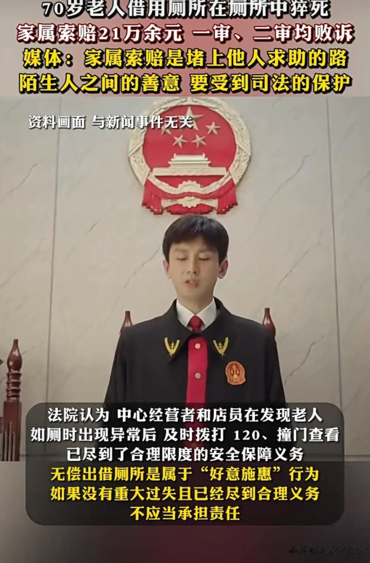 法院认为 ,中心经营者和店员在发现老人如厕时,出现异常后 ,及时拨打120、撞门查看已尽到了合理限度的安全保障义务无偿出借厕所是属于“好意施惠”行为如果没有重大过失且已经尽到合理义务不应当承担责任!